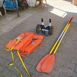 canoa a due posti marca Akita, dotata di 2 pagaie,2giubbotti salvagente e carello per trasporto a mano.
