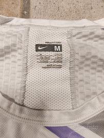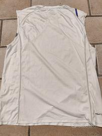 Canottiera Nike da tennis, modello utilizzato da Nadal per Wimbledon 2007. Bianca con dettagli grigi e viola. Usata ma ancora in buone condizioni, taglia M.