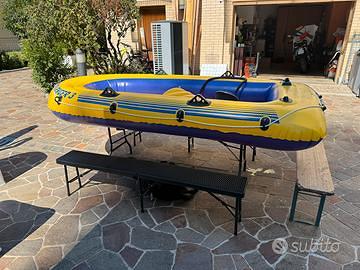 Vendo canotto Intex Challenger 3 posti, nuovo mai usato da fondo di magazzino completo di tutti i suoi accessori: Istruzioni di montaggio, kit riparazione, pompa maggiorata kit cuscini, corda perimetrale bianca, è più kit remi nuovo tutto chiuso.