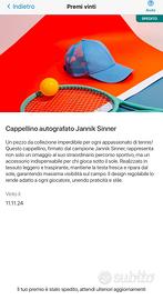 Vendo cappellino da tennis Nike autografato da Jannik Sinner. Il cappellino è stato vinto al concorso ISYBANK per le Nitto ATP Finals 2024 a Torino. Insieme al cappellino rilascerò una dichiarazione scritta e la fotocopia delle mail di vincita e gli screenshot dell'applicazione isybank dove si puo vedere la vincita (come da foto allegata all'annuncio).