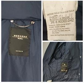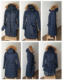 Come nuovo, cappotto trapuntato Max Mara Weekend, blu, con cappuccio rimovibile, ornato di pelo naturale, anch'esso removibile, con cerniera e automatici, guanti blu a manopola abbinati, imbottiti, tasche laterali con cerniera, cintura, chiusura con cerniera a doppio cursore e automatici, centrali, tasca interna, interamente foderato.