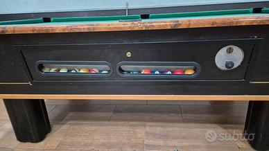 vendo carambola professionale con gettoniera da 1€ completa di set di palle da 15 piu il pallino bianco. condizioni ottime con solo qualche piccolo segno di usura.