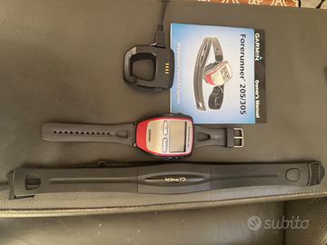 Cardiofrequenzimetro GPS da corsa e ciclismo Garmin Forerunner 305. Fascia elastica pettorale con sensori cardiaci. Monitora la frequenza cardiaca, la velocità, la distanza, il ritmo e le calorie bruciate.