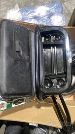 Carrello per sacca da golf con porta oggetti. Struttura come quella della prima foto della brochure, ancora da montare. Seconda foto dettaglio del porta oggetti.