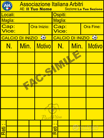 • Layout funzionale: spazi dedicati a squadre, punteggio, ammonizioni, espulsioni e note tecniche.