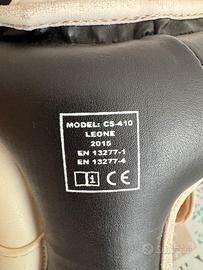 Il casco offre ampia protezione sulla nuca, fronte e orecchie e si allaccia con il velcro. L’interno è in vera pelle.