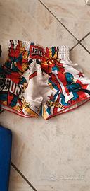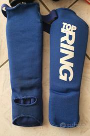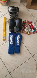 Caschetto con visiera protettiva Leone misura XS/S, guantoni TRJ FIGHT, paratibie TOP RING taglia XS, pantaloncino LEONE taglia S, cintura gialla ADIDAS. Completo di bambino 6/7 anni cedo in blocco. Guantoni e caschetto usati un paio di volte.
