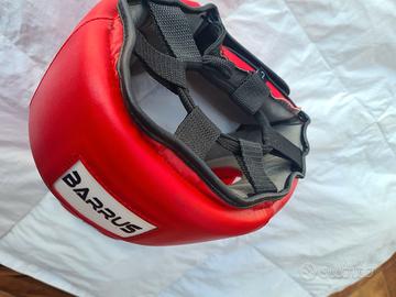 caschetto protettivo rosso Barrus, probabilmente in vinilpelle, per sport da combattimento come boxe, kick boxing, o muay thai.