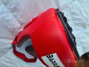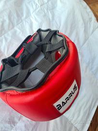 caschetto protettivo rosso Barrus, probabilmente in vinilpelle, per sport da combattimento come boxe, kick boxing, o muay thai.