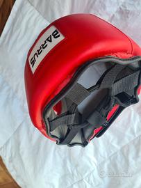 caschetto protettivo rosso Barrus, probabilmente in vinilpelle, per sport da combattimento come boxe, kick boxing, o muay thai.