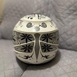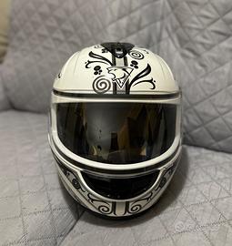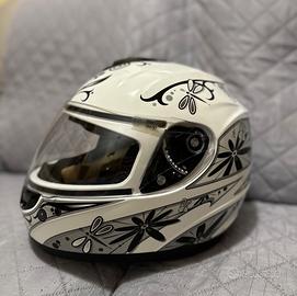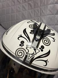 Casco da donna taglia S con visiera. Colore bianco con decoro farfalla grigia e nera. In ottimo stato, presenta dei segni di sverniciatura nella parte superiore.