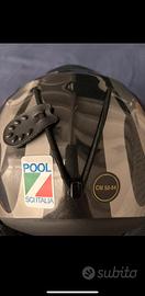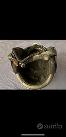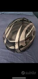 Casco da sci usato marca Alpina, colore nero e grigio scuro, misura 52-54cm, con ferma-maschera, prese d’aria, paraorecchie rigidi, e rotella di regolazione posteriore.