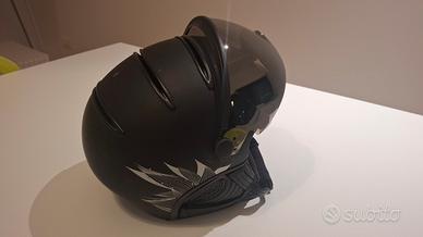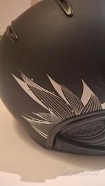 Vendesi casco usato da sci con visiera integrata. Colore nero e dettagli con grafica grigia e brillantini.