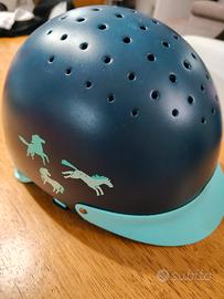 Casco di equitazione per bambino, in ottimo stato, perfetto per chi inizia o va a lezione. Regolabile con manopola posteriore, leggero e confortevole, con buon sistema di ventilazione e imbracatura sicura. Taglia M (55-58 cm), colore verde-turchese.