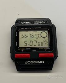 Casio Jogging 208 J-51W, orologio vintage anni ’80, water resistant 50 m, senza cinturino e con difetti e segni di usura dovuti all’utilizzo, con libretto d’istruzioni multilingua. L’orologio si accende (come visibile nelle foto) ma non è stato testato.