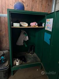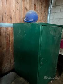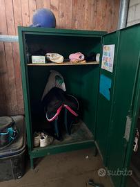 Cassone in metallo con doppio porta sella appendini laterali e mensola interna. Serratura sicura con tre chiavi di scorta Due ruote e due piedini Due maniglie pieghevoli sul restro per il trasporto. Nella foto un po in polverato Vendo per inutilizzo poiche ho smesso equitazione. Vendo a poco perche devo liberare lo spazio in maneggio. Possibilità di visionarlo su appuntamento.