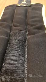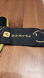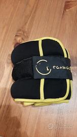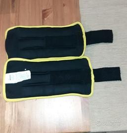 Coppia di cavigliere per allenamento in palestra, ciascuna da 1 kg. - Colore nero con bordi gialli. - Chiusura regolabile con velcro. - Marchio DOMYOS visibile su una delle cavigliere. segni di usura come da foto