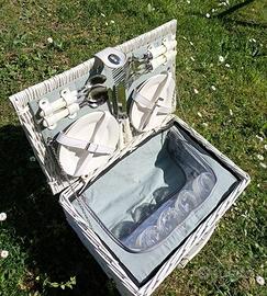 Cesta in vimini per picnic, di colore bianco, completa di piatti, posate e bicchieri per 4 persone, con ampio spazio isolante interno mediante chiusura a cerniera, per la conservazione caldo/fresco degli alimenti. Perfettamente nuova e mai usata. Misure cm. 45 x 35 x 20