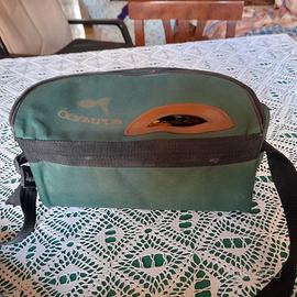 Cestino da pesca con rivestimento esterno verde antipioggia e interno in vimini come da foto. Sul frontale ci sono due tasche esterne porta oggetti. Coperchio apribile con cerniera e fenditura per inserire il pescato. Le dimensioni esterne sono: lunghezza 30 cm, larghezza 21 cm, altezza 16 cm. Le dimensioni interne sono: lunghezza 29 cm, larghezza max 8 cm, altezza max 13 cm. Lunghezza della cinghia a tracolla: 112 cm-