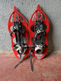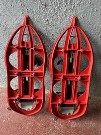 ciaspole TSL modello 225, caratterizzate dal classico telaio a clessidra e dal colore rosso acceso.