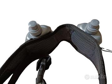 Cintura con 2 porta borracce (comprese) kalenji, corredato di due piccole tasche laterali con cerniera per riporre chiavi e altre piccoli oggetti. Chiusura clip clap e morbida protezione interna con retina. Prodotto mai usato, nuovo senza cartellino