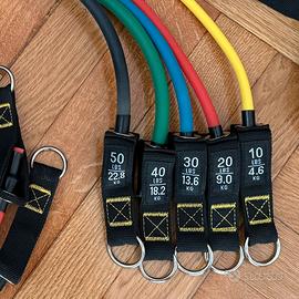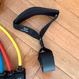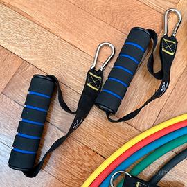 Comprate come regalo, ma poi cambiato idea, il kit completo comprende : 5 fasce di resistenza di diverse gradazioni che si possono combinare tra loro (4,6 kg, 9 kg, 13,6 kg, 18,2 kg, 22,8 kg - tutte insieme 68,2 kg) 2 maniglie per fissare una o più fasce 2 cinturini per caviglia per fissare una o più fasce 1 ancoraggio per porta per fissare una o più fasce 1 poster di allenamento 1 manuale di istruzioni 1 borsa per il trasporto Scatola originale Dalla descrizione del sito dove le ho comprate : Realizzate in lattice naturale ecologico con un'eccellente durata e perfetta elasticità. Le fibbie in metallo sulle maniglie sono extra forti per garantire la sicurezza durante l'uso. Le impugnature sono in schiuma morbida e antiscivolo. L'ancoraggio per le porte è ispessito e morbido in modo da non danneggiarle. Il Poster per allenare diverse parti dei muscoli e il Manuale di istruzioni dettagliato ti informano su come utilizzare le fasce e gli accessori. Le fasce da allenamento possono aiutarti a lavorare gambe, fianchi, spalle, braccia, schiena, rafforzare bicipiti, addominali e molto altro ancora.