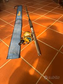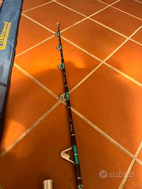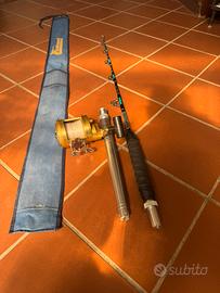 Cedo combo composto da canna Duel 20/50 libbre, manico in alluminio smontabile e carrucole inox AFTCO Made in U.S.A., fodero originale e mulinello Duel 4/0 by Italcanna imbobinato con nylon Asso tripla forza,max drag 50 libbre, in blocco, attrezzatura di qualità che non necessita di presentazioni, ideale per traina e/o drifting.Eventualmente disponibile anche cintura Italcanna con giubbino con harness Sardamatic.