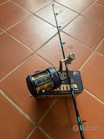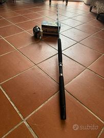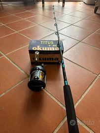 Cedo in blocco combo composto da canna Shimano 20/30 libbre nuova con mulinello Okuma Titus T30 imbobinato con 270 metri di trecciato Shimano Power Pro Yellow Made in U.S.A., ideale per traina