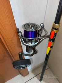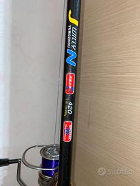 canna quattro sezioni, rinforzi in ferro sia canna che mulinello, nylon viola.
