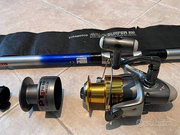 Combo surfcasting: Canna da pesca surfcasting Trabucco Avalon Surfer, 4 metri, max casting 200 gr. molto potente, come nuova, con coprianelli e fodero originale.