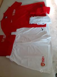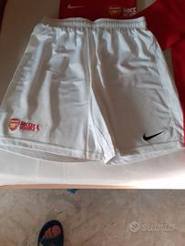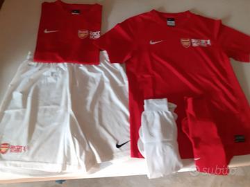 Completo da calcio della squadra inglese ARSENAL, composto da 2 maglie a mezza manica di colore rosso con logo squadra taglia XL, pantaloncino bianco con logo squadra taglia XL, 2 paia calzettoni rossi , 1 paio di calzettoni bianchi. Completano il tutto parastinchi NIKE modello Tiempo Park Guard taglia L . All'eventuale acquirente regalo paio di guanti da portiere NIKE, modello GK Jr. Grip taglia 7. Articoli usati poco per passaggio ad altra disciplina sportiva .