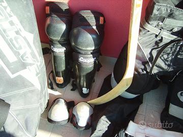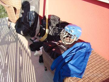 completo da hockey buone condizioni per persona alto 1,70 comprende casco, guanti, pantaloni, maglia, ginocchiere, parastinchi ,conchiglia, borsa no bastone vendo il lotto intero a 190 euro.