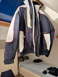 Completo da sci da uomo composto da giacca tipo “bomber “ blu e grigio chiaro con profili rossi, tasche laterali ed interna chiuse da zip con profilo rosso + 2 pantaloni abbinati, uno grigio chiaro ed uno blu, sempre con profili rossi e tasche laterali . Marca : No Limits. Tagl 50.