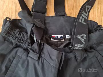 Giacca e pantaloni della FILA per sport invernali sci ecc. anni 12 , Giacca con polsini cappuccio ed è inoltre dotata di gonna da neve che chiude la giacca in vita con elastico, pantaloni complete di bretelle elastiche e ghette interne con elastico su scarponi alti.