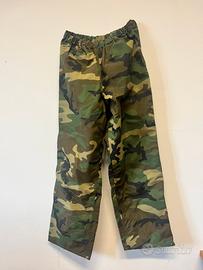 Giacca e pantalone mimetici taglia 48 realizzati in materiale tecnico impermeabile.