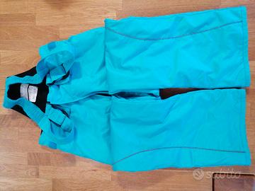 2 tasche esterne con cerniera e interne con retina, lunghezza braccio regolabile con un elastico interno. Pantaloni salopette azzurro turchese, lunghezza regolabile, ghette. Giro vita regolabile.