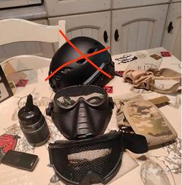 tutto praticamente nuovo, copertura pieghevole mezza faccia, guanti e tuta mimetica e piccioli oggetti maschera intera, occhiali, porta pallini, guardare ultima foto