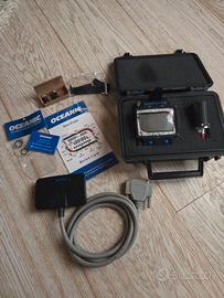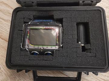 Computer per immersioni subacquee Oceanic DataTrans Pro, usato ma in ottime condizioni, come dimostrano le foto (altre disponibili su richiesta, se volete). Dotato di sonda da collegare al primo stadio del gruppo erogatore, per poter aver disponibile a display la pressione della bombola aggiornata in tempo reale (comunicazione col computer via segnale radio codificato). Completa di valigetta stagna originale, e di cover di protezione in plexiglass trasparente (un angolo della cover e' leggermente presenta una crepa, ma e' presente da tempo senza pregiudicare l'uso del computer). Completo di manuale di istruzioni, manuale di utilizzo veloce impermeabile, set di batterie di ricambio acquistate recentemente (ma sono al litio, quindi non soffrono di decadimento precoce), o-ring di ricambio per i vani batterie e cavo per poter scaricare i dati nel computer via infrarossi (attenzione: richiede un PC con alcuni requisiti particolari !).