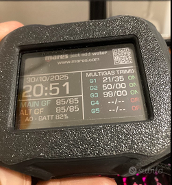 Mares QUAD Ci + Sonda LED (2025) - Come nuovo, in Garanzia Vendo per inutilizzo Mares QUAD Ci (Color Integrated) con integrazione sonda, in condizioni impeccabili .Acquisto Computer: 8 Novembre 2024. Acquisto Sonda LED: Gennaio 2025. Stato: Pari al nuovo, batteria 99%, schermo perfetto. Algoritmo Bühlmann ZH-L16C, display a colori IPS, Bluetooth, gestione multigas. fino al 99%- gradient Factor personalizzato, bussola integ. Fornisco scontrini originali per la garanzia ufficiale. Incluso di scatola, cavo USB e manuali. Prezzo: 520€ (poco trattabile)