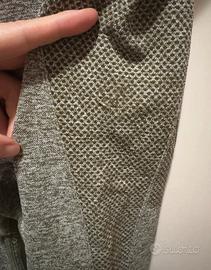 Coordinato Just Strong taglia L: - Leggings lunghi seamless sculpt. Tessuto tecnico seamless morbido e traspirante con trama a puntini/ nido d'ape, super stretch e squat proof. Vita alta doppia con logo ricamato bianco "JUST STRONG". Cavallo e parte centrale interni in ottime condizioni. Piccoli segni di usura sull'esterno laterale sinistro (coscia/fianco) → 2-3 piccole zone con leggera sfilacciatura/pilling superficiale (visibili nelle foto ravvicinate). - Sport Bra seamless sculpt. Modello racerback con inserti verde oliva sotto il seno, stesso tessuto seamless dei leggings. Buona vestibilita e supporto medio (presenza di coppe), fascia sotto elasticizzata. Sul bralette leggera usura interna nella parte che appoggia sulla schiena (tipica zona di sfregamento). In generale ottime condizioni. Color mélange oliva.