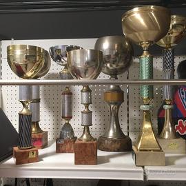 Vendo Coppe Trofei di varie dimensioni e altezze a prezzo da concordare . Da 5 euro ad 15 euro. In perfette condizioni , disponibili una ventina di pezzi.