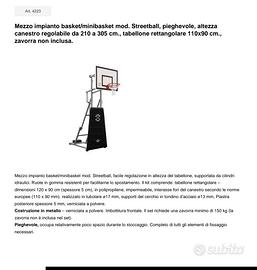 Mezzo impianto basket/minibasket mod. Streetball, facile regolazione in altezza del tabellone, supportata da cilindri idraulici. Ruote in gomma resistenti per facilitarne lo spostamento. Il kit comprende: tabellone rettangolare – dimensioni 120 x 90 cm (spessore 5 cm), in polipropilene, impermeabile, interasse fori del canestro secondo le norme europee (110 x 90 mm). realizzato in tubolare ø17 mm, supporti del cerchio in tondino d'acciaio ø13 mm, Piastra posteriore spessore 5 mm, verniciata a polvere.