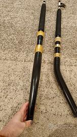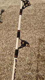 canne da pesca nuove, una mai usata mentre l'altra ha solo un'uscita. Manico curvo specifico per big game e deep drop. il manico curvo fornisce una leva superiore riducendo l'affaticamento. canne dal fusto estremamente sottile ma con una potenza incredibile per sollevare pesci enormi. anelli alps rx a carrucola ultra resistenti. prezzo per la coppia