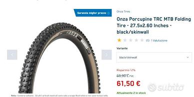 Onza Porcupine TRC MTB Folding Tire - 27.5x2.60 Inches - black/skinwall listino € 69 cadauno propongo la coppia a € 89