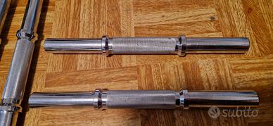 Vendo due coppie manubri per dischi pesi, lunghezza 35cm, senza molle, interno pieno, diametro 28mm – 20 euro a paio, manubrio singolo, interno vuoto, lunghezza 38cm, con molle, diametro 25mm – 10 euro.