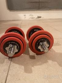 2 manubri, 4 dischi da 2.5kg e 4 dischi da 1.25.