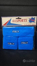 Coppia di polsini più fascetta per capelli trrgisudore dell'Italia, stampa anteriore e posteriore, nella loro confezione originali, non aperti. Ideali per sportivi e tifosi.