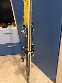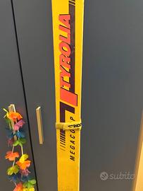 coppia di sci vintage a marchio Tyrolia, modello MEGACOMP, risalenti al periodo a cavallo tra la fine degli anni '80 e l'inizio degli anni '90. Si tratta di sci dal classico design "dritto" (non sciancrato), caratterizzati da una livrea vivace sui toni del giallo fluo e magenta, tipica dell'estetica "retro ski" di quel periodo. Il set è completo e pronto per essere esposto come complemento d'arredo originale per taverne, case di montagna, locali a tema o per collezionisti di attrezzatura sportiva d'epoca. Materiali Struttura dello sci in materiale composito/sintetico tipico dell'epoca. Attacchi in metallo e materiale plastico ad alta resistenza. Dimensioni Lunghezza sci: 175 cm. Condizioni Usato in buone condizioni come da foto. Le solette e la serigrafia superiore presentano i normali segni del tempo e dell'utilizzo, ma l'integrità strutturale appare conservata, rendendoli ideali per uso espositivo o decorativo.