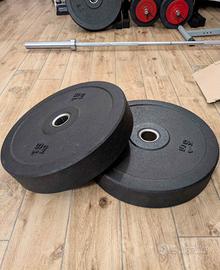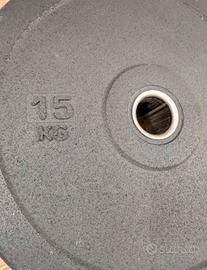 Coppia dischi bumper da 15 kg, come nuovi. Adatti a bilancere olimpico con foro da 50mm. Prezzo disco singolo sul sito: 58,50€