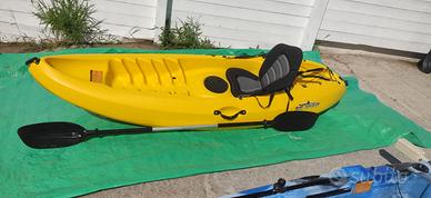 Il kayak SKF SUN è il compagno ideale per il tempo libero, le brevi escursioni sottocosta e la pesca amatoriale. Grazie alla sua larghezza di 80 cm, offre una stabilità eccezionale, rendendolo sicuro e facile da usare anche per i principianti o per chi ha una corporatura fino a 100 kg. Essendo un modello sit-on-top auto-svuotante, garantisce la massima sicurezza: in caso di ribaltamento, il kayak non si riempie d'acqua ed è facilissimo risalire a bordo. Con un peso di soli 19 kg, è estremamente agile da trasportare sul tetto dell'auto o a mano. Condizioni: I kayak sono stati utilizzati esclusivamente per scopi pubblicitari (shooting fotografici). Il polietilene è in condizioni eccellenti, privo di graffi da trascinamento o segni di usura significativi. Caratteristiche tecniche: Dimensioni: Lunghezza 270 cm | Larghezza 80 cm Peso: 19 kg (leggerissimo e maneggevole) Portata massima: 130 kg Allestimento incluso: Sedile comfort imbottito (regolabile), pagaia smontabile, gavone stagno centrale con sacca interna, maniglie di trasporto ergonomiche e rete elastica posteriore. Opzioni d'Acquisto: Singolo Kayak (con sedile e pagaia): € 270 COPPIA DI KAYAK (Kit completo x2): € 520 Possibilità di trasporto entro 50km (+€100).